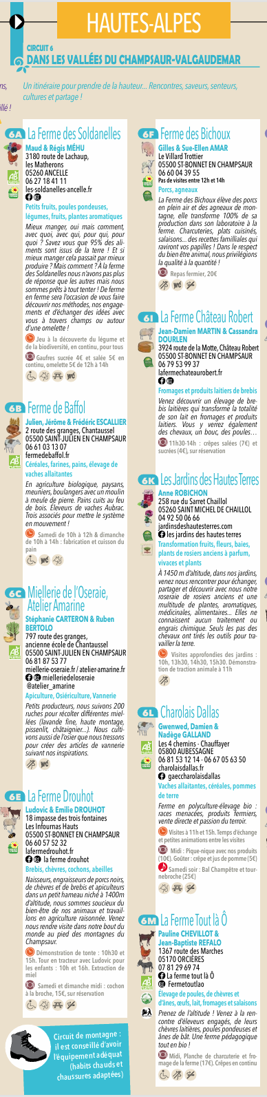 L'évènement "De Ferme en Ferme" fait son retour en vous proposant un itinéraire pour découvrir plusieurs fermes dans notre département et le 04. Dans nos vallées du Champsaur-Valgaudemar, 9 fermes ouvrent leurs portes et vous proposent de découvrir leurs savoir-faire de 10h à 18h (visites pédagogiques gratuites, ateliers, dégustations...).