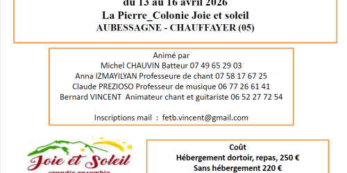 La colonie Joie et Soleil, située à la Pierre (AUBESSAGNE), propose un stage Chant-Musique...