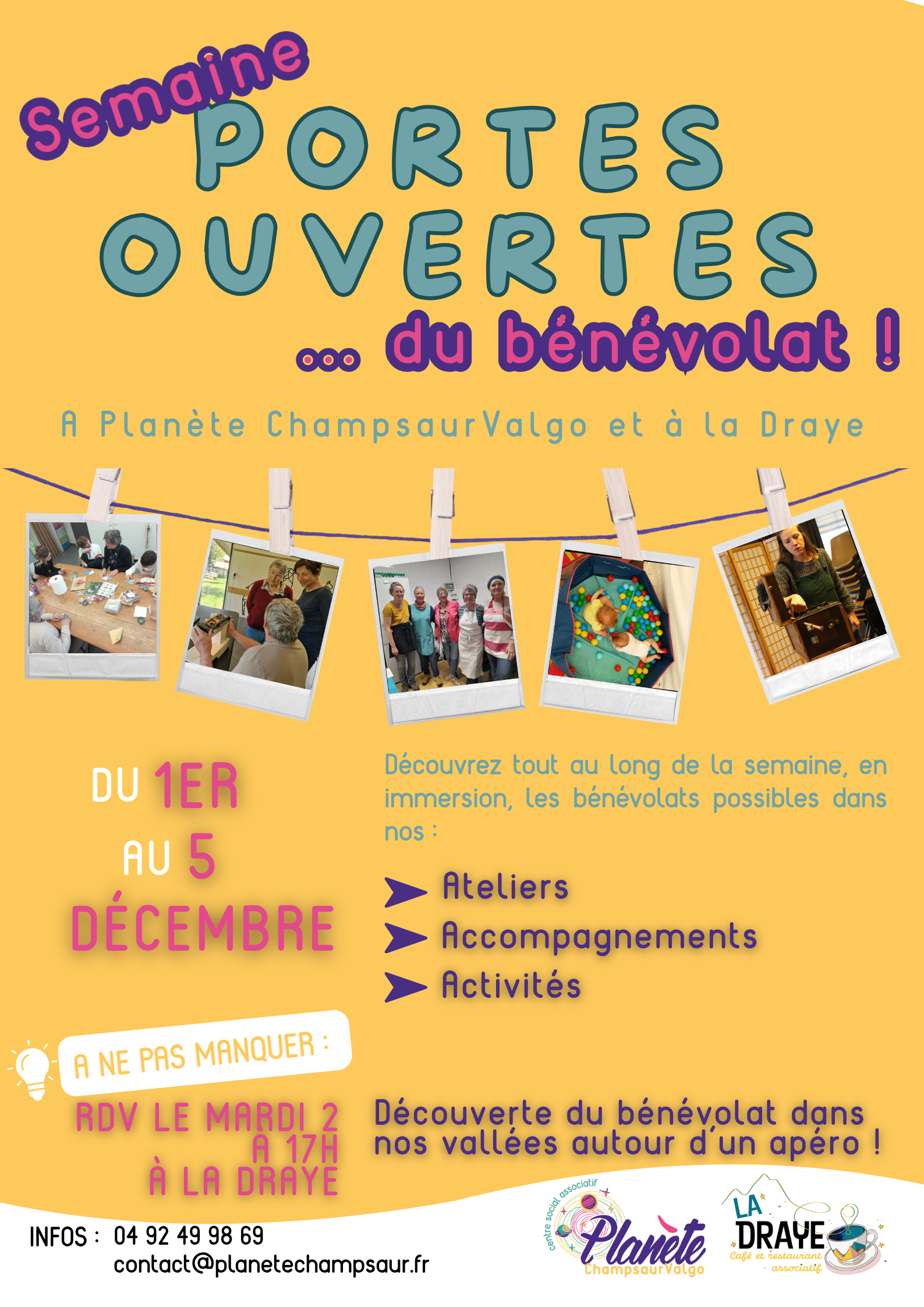 Dans le cadre de sa Semaine des Portes Ouvertes du Bénévolat, le centre social Planète ChampsaurValgo organise également un temps dédié à la découverte des différentes formes de bé...