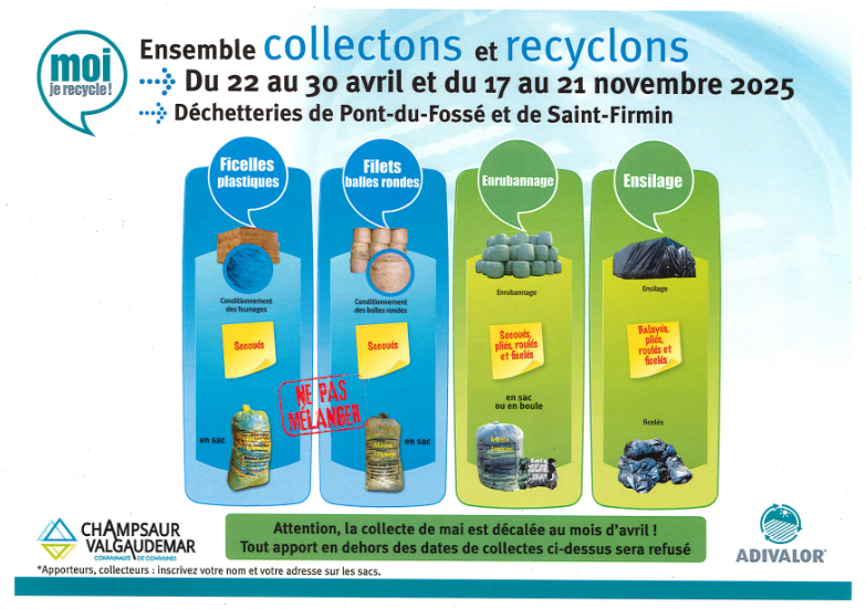 ADIVALOR, en partenariat avec la Communauté de Communes Champsaur Valgaudemar, vous informe que la prochaine CAMPAGNE DE COLLECTE DES DÉCHETS AGRICOLES aura lieu DU LUNDI 17 AU VENDREDI 21 NOVEMBRE 2025.