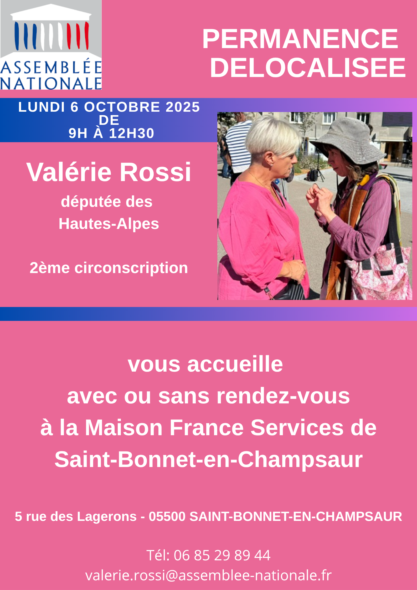 Madame Valérie Rossi, députée de la deuxième circonscription des Hautes-Alpes, tiendra une permanence délocalisée
