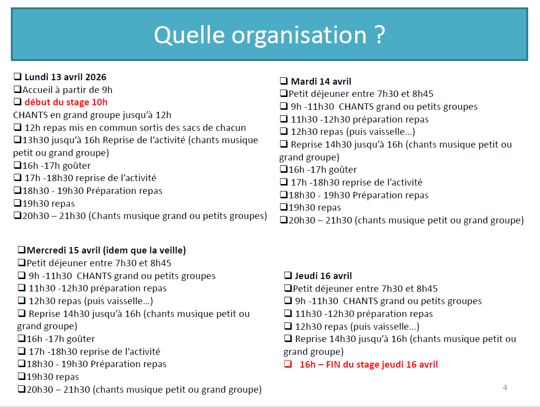 La colonie Joie et Soleil, située à la Pierre (AUBESSAGNE), propose un stage Chant-Musique et Partage du lundi 13 avril au jeudi 16 avril 2026.