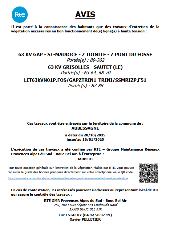 Des travaux d'élagage et d'abattage vont être entrepris sur notre commune, afin d'assurer le bon fonctionnement des lignes hautes tension et la sécurité des personnes aux abords de ces ouvrages.