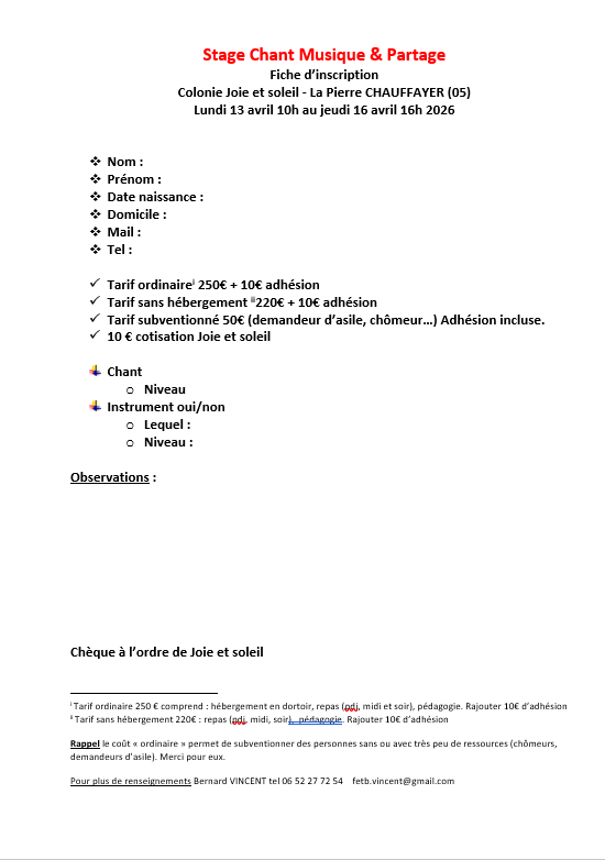 2026 - Stage Chant Musique & Partage (Joie et Soleil)